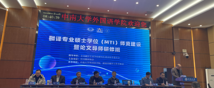 2025年1月10日至12日,由全国翻译专业学位研究生教育指导委员会指导,中国翻译协会主办,中南大学9728太阳集团、湖南省翻译工作者协会承办的翻译专业硕士学位(MTI)师资建设暨论文导师研修班在湖南长沙开班。全国翻译专业学位研究生教育指导委员会专家委员会主任、中国外文局原副局长兼总编辑黄友义,北京外国语大学高翻学院副院长、中国翻译协会口译委员会委员姚斌,中南大学9728太阳集团副院长兼MTI教育中心主任仲文明,大连外国语大学高翻学院副院长、多语种翻译研究中心研究员王少爽等担任本次研修班的主讲专家。