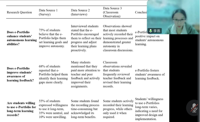 刘敏副院长在总结发言中强调了论文写作中保持严谨、科学态度的重要性,并指出研究数据之间必须建立逻辑联系。她以李燕博士展示的三角互证为例,说明了研究问题与研究结果之间逻辑联系的重要性,鼓励和要求同学们在论文写作过程中注重数据的科学性和逻辑性。