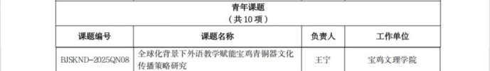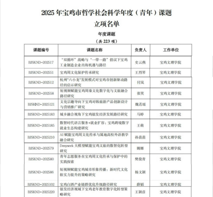 近日,宝鸡市哲学社会科学工作领导小组办公室公布了2025年宝鸡市哲学社会科学年度课题立项名单,全市共获批233项,我校立项143项,其中我院1名教师获批2024年度宝鸡市哲学社会科学青年课题,13名教师获批2024年度宝鸡市哲学社会科学年度课题,获批数量创历史新高。