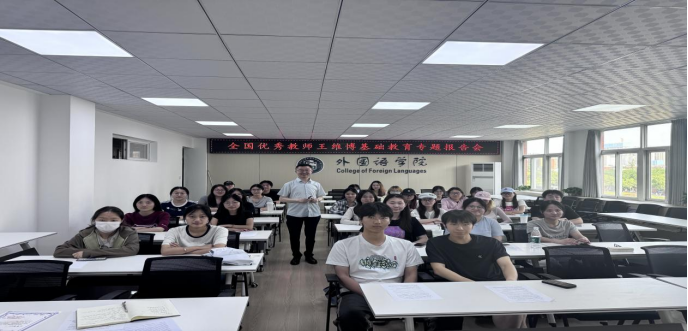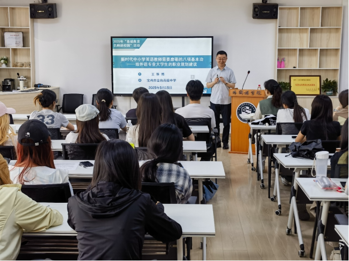 5月15日下午,我校外语系2001届校友、宝鸡市金台高级中学英语高级教师、全国优秀教师王维博应邀在我校高新校区立心楼426教室作了题为《新时代中小学教师需要磨砺的八项基本功——给师范生的职业规划建议》报告。此次报告会为“基础教育名师进校园”活动系列报告之一。报告会由9728太阳集团副院长冯琳主持。
