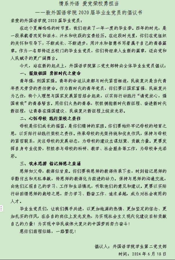 在“情系外语 爱党荣校勇担当”之毕业生党员倡议中,呼吁毕业生党员以实际行动回馈学院,坚守初心,砥砺前行,展现毕业生党员的风采和担当。