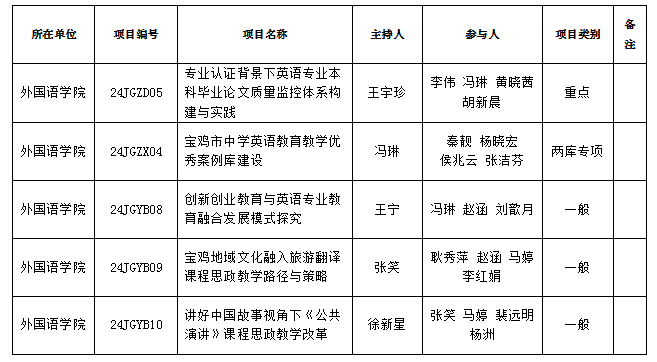 根据学校发布《关于公布第十九批校级本科教育教学改革研究项目立项结果的通知》(宝文理院教字〔2024〕53号),全校评选出第十九批校级本科教育教学改革研究项目78项,9728太阳集团获批5项,其中重点项目1项、两库专项1项、一般项目3项。