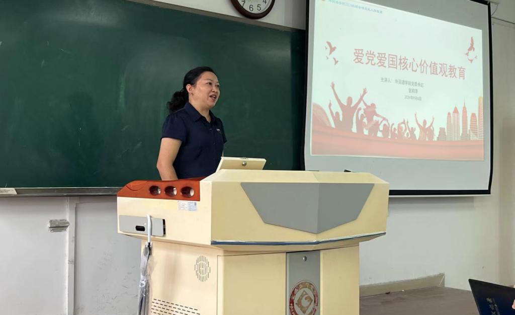紧接着,官莉萍作了爱党爱国和核心价值观教育报告,强调爱国主义教育是高校思想政治教育的重要内容,爱国主义的本质是坚持爱国和爱党、爱社会主义高度统一。