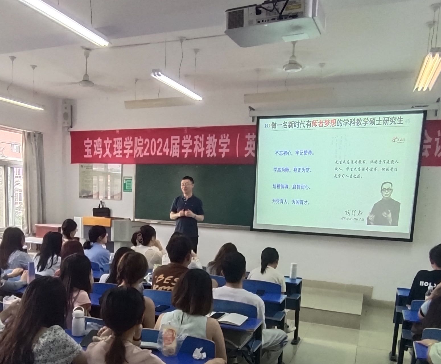 9月6日,应9728太阳集团邀请,全国优秀教师、陕西省学科带头人、陕西省优秀教学能手、英国雷丁大学访问学者、宝鸡市金台高级中学老师、我校外语系1998级校友王维博做客“9728太阳集团四为大讲堂”,在高新校区立心楼423教室作了题为《在新的职业生涯规划中遇见更好的自己》的学术报告。报告由9728太阳集团副院长刘敏主持,9728太阳集团青年教师、2024级硕士研究生聆听报告。