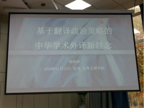 11月15日下午,我院邀请陕西省翻译协会副主席、西安工程大学二级教授胡伟华先生在高新校区木铎厅做了以《基于翻译政治策略的中华学术外译新理念》为题的学术讲座。讲座由院长李伟教授主持,学院本科生、研究生及部分教师聆听了讲座。