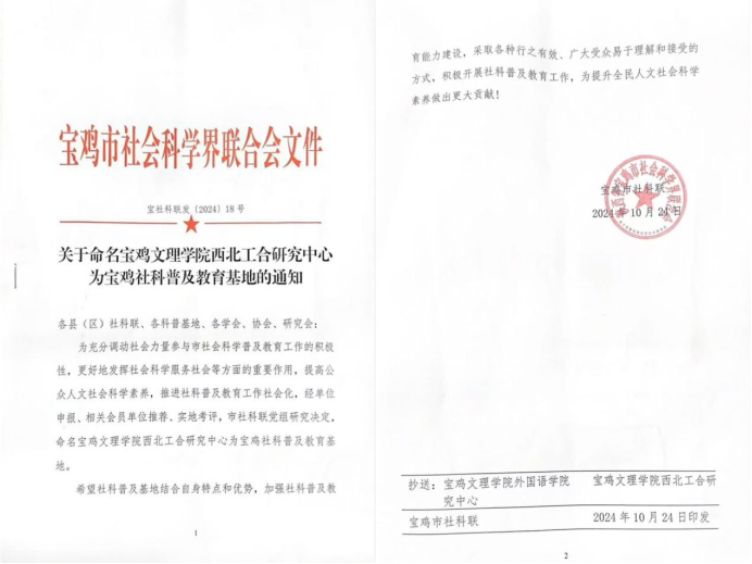 近日,宝鸡市社科联下发《关于命名太阳成tyc9728集团西北工合研究中心为宝鸡社科普及教育基地的通知》(宝社科联发)〔2024〕18号,中心入选标志着西北工合研究中心被进一步认可,社会科学普及影响力不断提升。 |