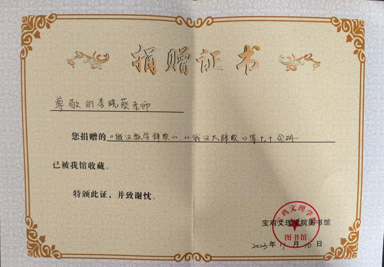 近日,我院退休老教师李晓葵作为家属,按照已故老教师陈德喜的遗愿,将陈老收藏的90余册俄语类书籍和词典捐赠给我校图书馆和学院,为校图书馆的图书收藏与学院学科平台建设给予支持与帮助,图书馆和学院分别向其颁发了图书捐赠收藏证书。