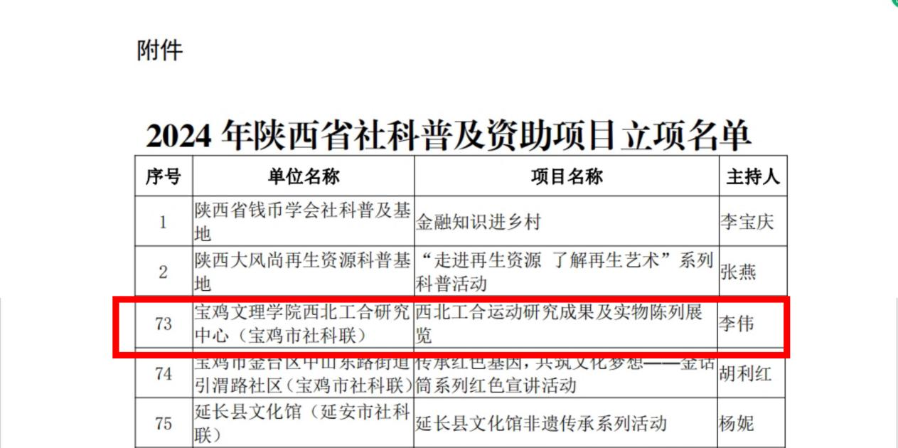 近日,陕西省社会科学界联合会领导小组办公室公布了2024年陕西省社科普及资助项目立项名单,全省共获批81项,我校西北工合研究中心主任李伟教授获批2024年度陕西省社科普及资助项目。