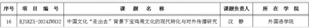 近日,宝鸡市哲学社会科学工作领导小组办公室公布了宝鸡周文化研究专项课题立项名单,全市共获批32项,其中我校获批16项,我院教师汶静获批宝鸡周文化研究专项课题。