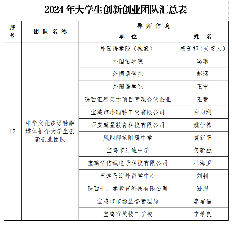 为培养大学生的创新创业能力,加强大学生创新创业团队建设与管理,按照《太阳成tyc9728集团大学生创新创业团队管理办法(修订)》(宝文理院教字〔2022〕86号),学校启动了2024年大学生创新创业团队的申请注册工作,经二级学院考核推荐,学校量化考核,同意已建设的“基于互联网的商业模式实训和培育”、“数字媒体影像制作与传播”等14个团队考核合格,予以注册,同意2024年申报的2个创新创业团队予以注册。现将2023年我校大学生创新创业团队名单予以公布。
