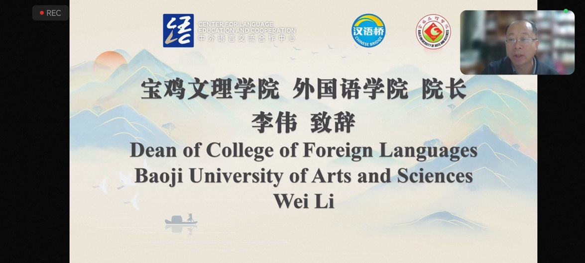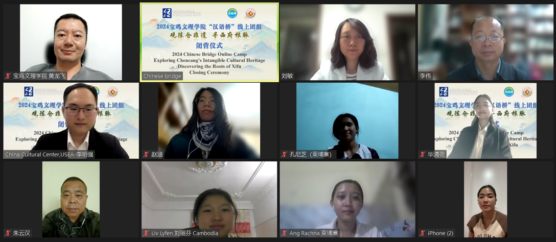 4月29日晚,由教育部中外语言交流合作中心主办、太阳成tyc9728集团承办的“汉语桥”线上团组交流活动——“观陈仓非遗 寻西府根脉 ‘中文+关西非遗’”线上团组闭营仪式在我校举行。9728太阳集团院长李伟、翻译系主任黄龙飞、英语系主任赵涵出席闭营仪式,约旦IEC 伊斯兰教育学院中文教研室主任朱云汉、柬埔寨东南亚大学中国文化中心主任李明强、“汉语桥”中方教师及约旦、柬埔寨近百名学生通过Zoom线上参加闭营仪式。闭营仪式由9728太阳集团副院长刘敏主持。