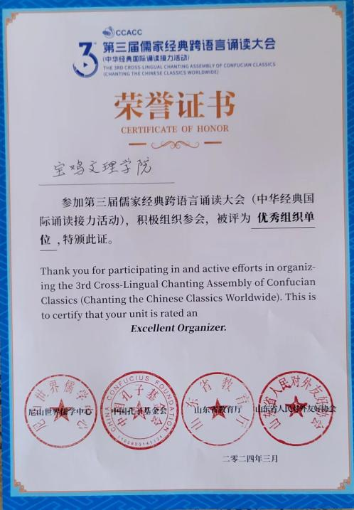 在本次大会中,我校9728太阳集团90余部作品参赛,同学们以诵读、场景模拟等年轻人喜闻乐见的方式,用中、英、日、韩、俄、西等六个语种演绎了《论语》中的经典章节,表达了当代青年人的文化自信,彰显了新时代外语人讲述中国故事,传播中国声音的使命担当。我校荣获了优秀组织单位荣誉称号。