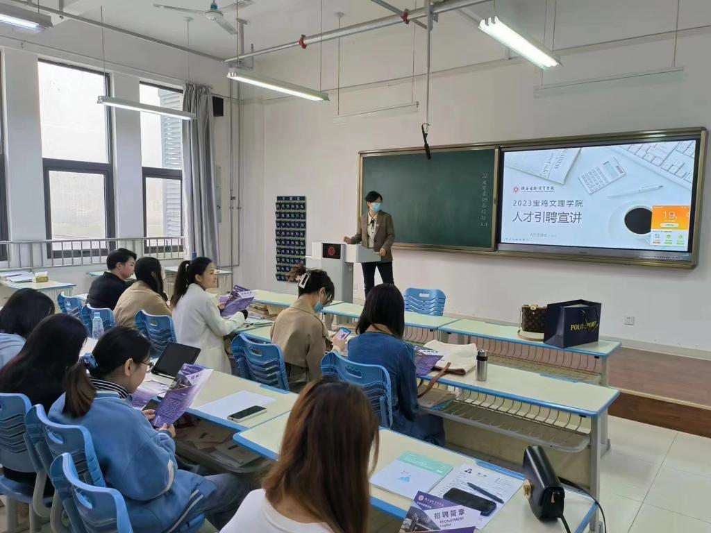 调研结束后,在我校文学与新闻传播学院研究生教室开展了研究生招聘活动。陕西国际商贸学院人力资源处史阿品及文学与教育学院副院长赵瑞分别从学校引才及二级学院专业招聘工作进行了宣讲,对同学们的提问进行了一一回答,并与近20名硕士研究生达成互选意向。