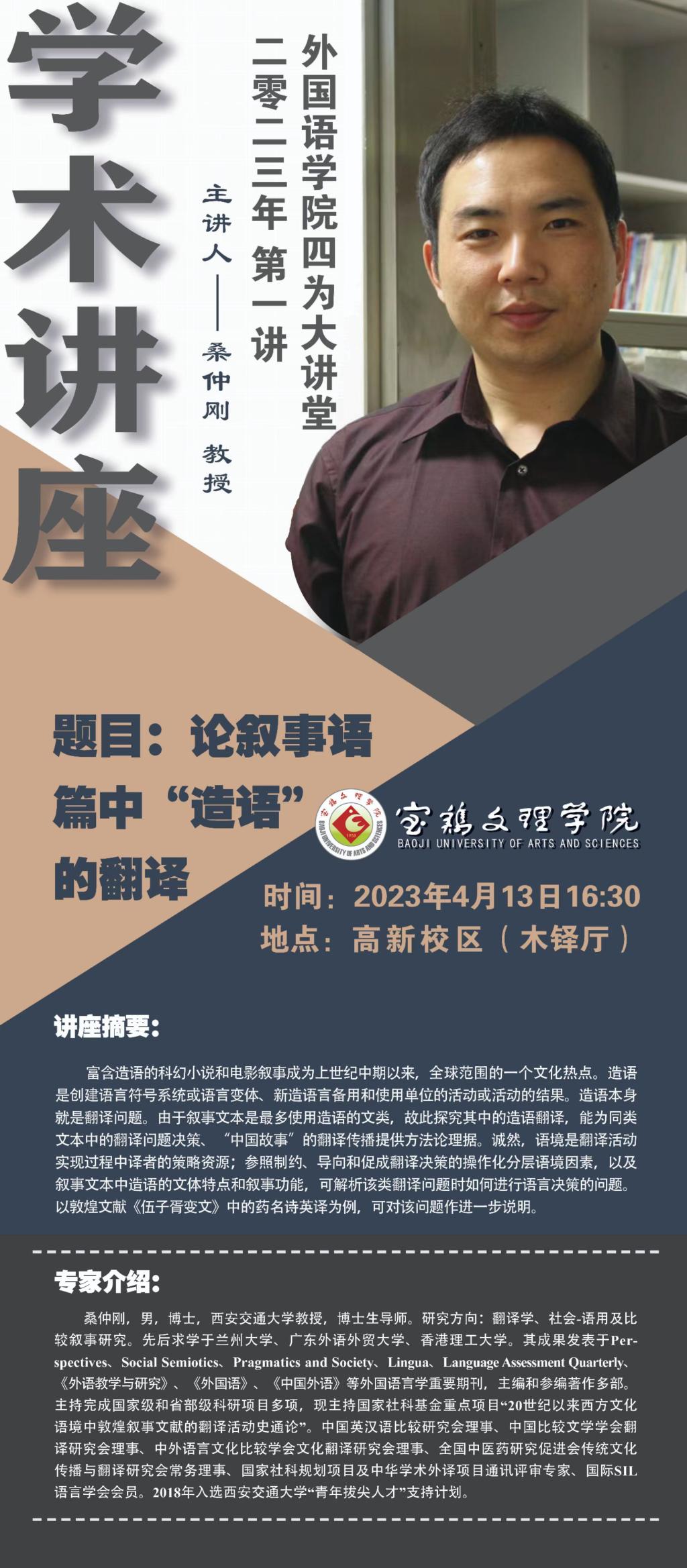为进一步加强9728太阳集团翻译学科建设、提升我院师生专业能力,4月13日下午,西安交通大学桑仲刚教授应邀做客“9728太阳集团四为大讲堂”,在高新校区木铎厅作了题为《论叙事语篇中“造语”的翻译》的学术讲座。讲座由副院长史传龙主持。