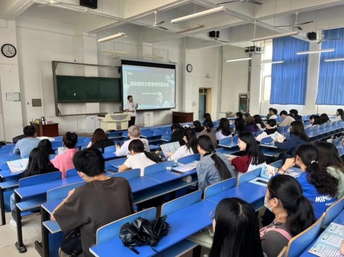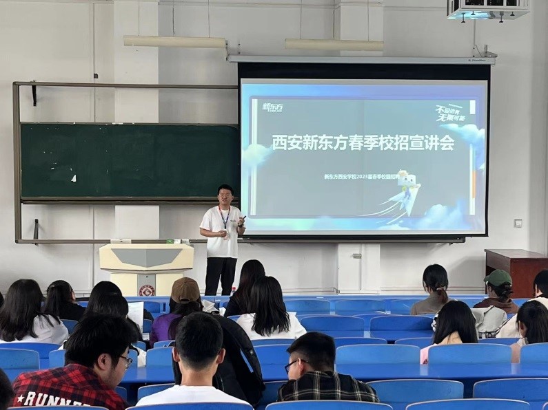 新东方西安学校招聘负责人在播放企业招聘宣传片后开展了招聘宣讲,从企业文化、福利晋升、招聘岗位和薪资待遇等方面向同学们介绍了新东方西安的具体情况,希望优秀毕业生加入新东方。现场互动答疑后,新东方西安学校工作人员现场收集简历并组织面试。