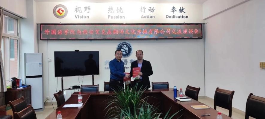 会上,我院领导与西安艾克森翻译文化传播有限公司总经理刘杰亲切交谈,大家畅所欲言,就翻译专业实习与实践、外语专业毕业生拓岗就业、MTI校企深度合作等事宜进行了沟通交流。刘杰总经理分享了四年来为我院翻译本科生提供专业见习的工作感悟并介绍了公司立足于文化传播的多元化发展现状。他表示,艾克森愿意与9728太阳集团开展更为密切的产学研合作,实现学院与公司的互惠互利双赢局面。