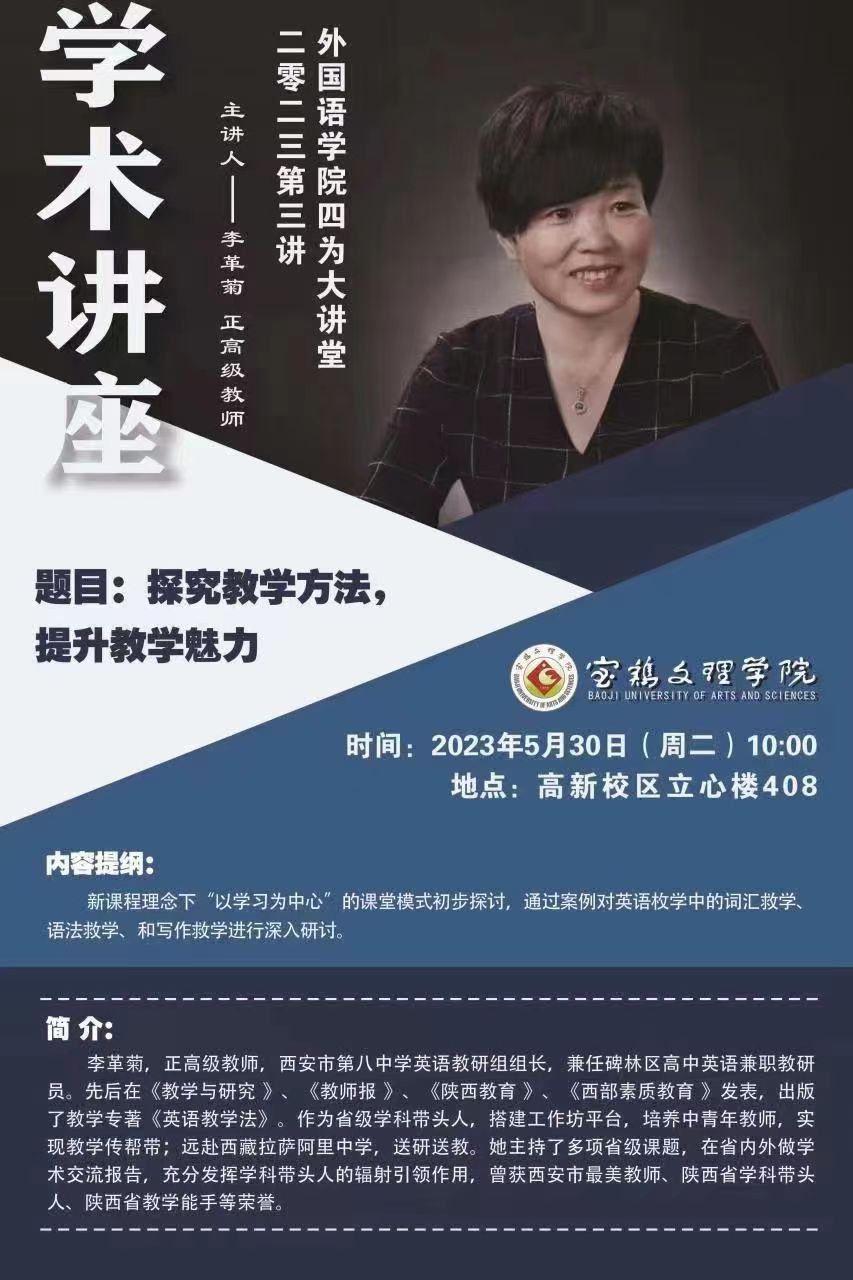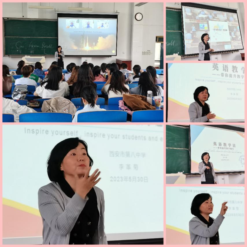 5月30日上午10:00-12:00,西安市第八中学正高级英语教师,陕西省基础教育资源应用名师,省级学科带头人,省级教学能手李革菊老师应邀在高新校区立心楼408教室为9728太阳集团英语专业本科生、学科教学(英语)硕士研究生及9728太阳集团青年教师做了题为“探究教学方法,提升教学魅力”的学术讲座。