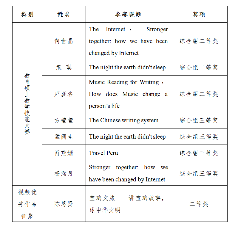近日,我校研究生院联合各二级学院,举办了第二届研究生学术节。此次学术节以“六十五载峥嵘岁月 科创演绎青春风采 理想共筑文理华章”为主题,包含学术讲座、学术论坛、教育硕士教学技能大赛等多项活动。我院研究生踊跃参与并斩获佳绩,充分展现了我院研究生良好的学习风貌,也进一步激发了研究生主动学习和参与科学研究的积极性。依据宝文理院研字〔2023〕9号《关于表彰第二届研究生学术节获奖个人的决定》,何世晶、袁琪、卢彦名三位同学在教育硕士教学技能大赛中获综合组二等奖,方莹莹、孟阎生、肖燕姗、杨涵月四名同学在教育硕士教学技能大赛中获综合组三等奖;陈思贤在视频优秀作品征集中获得二等奖。
