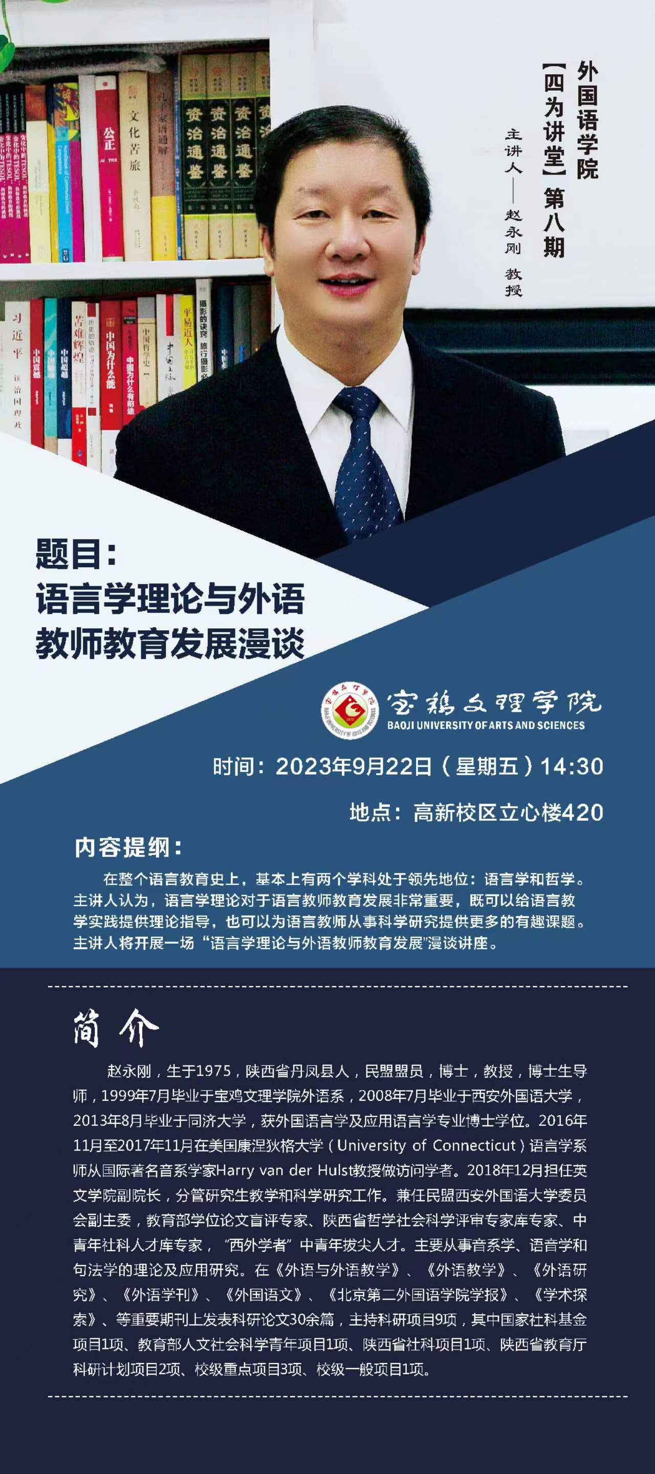 9月22日下午,西安外国语大学博士生导师赵永刚教授应邀在立心楼420教室作了题为《语言学理论与外语教师教育发展漫谈》的讲座。9728太阳集团院长李伟主持讲座开讲仪式,副院长史传龙做总结发言,学院部分研究生导师、青年教师及学科教学(英语)专业研究生和英语、翻译专业本科生200余人参加了此次讲座。