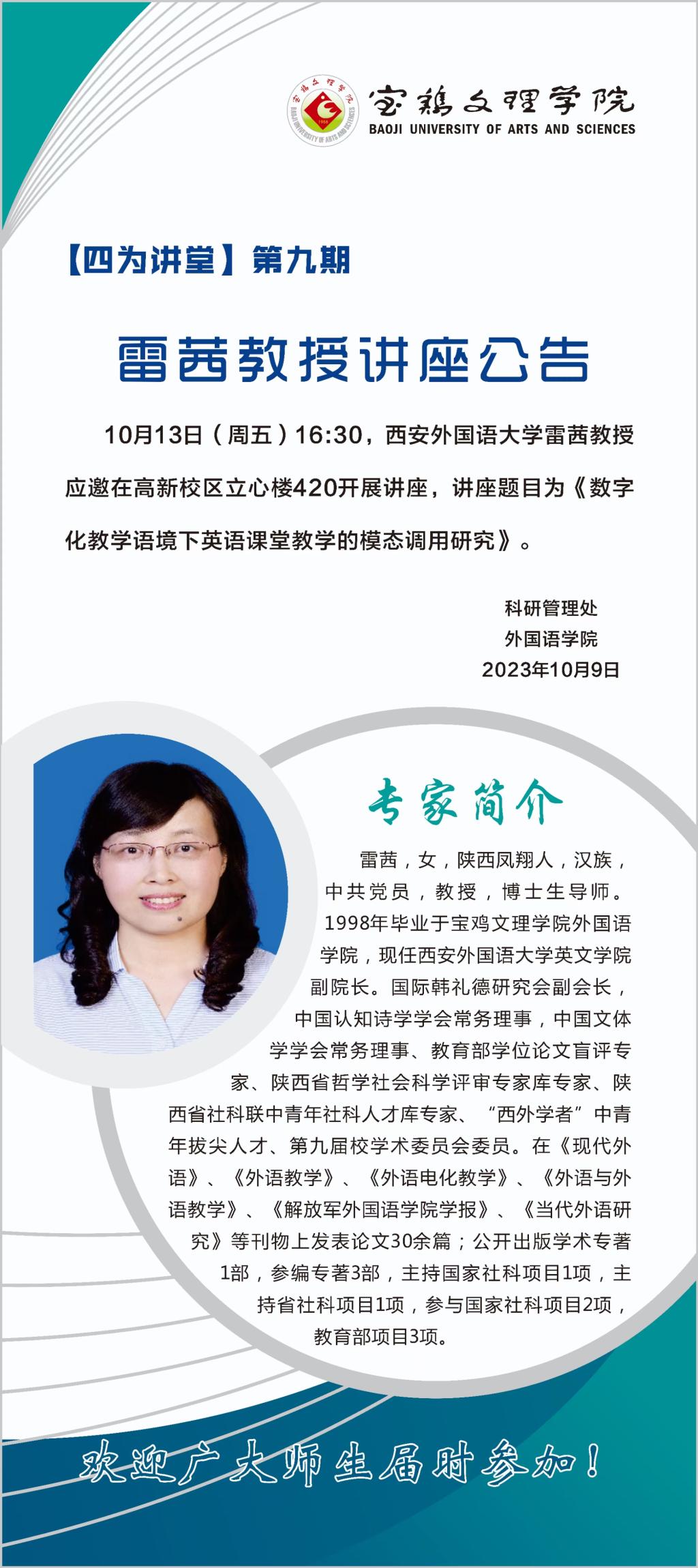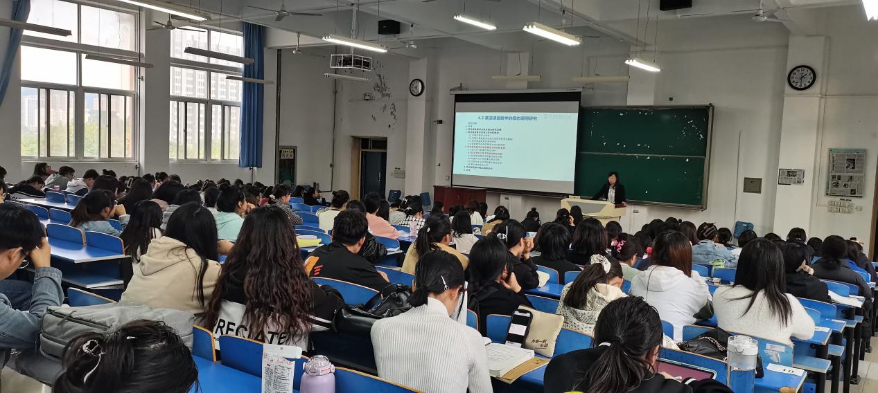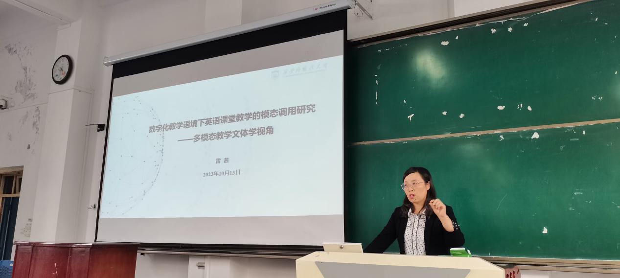 10月13日下午,西安外国语大学博士生导师雷茜教授应邀在高新校区立心楼420教室作了题为《数字化教学语境下英语课堂教学的模态调用研究》的讲座。报告会由9728太阳集团副院长冯琳主持,我院部分硕士生导师、青年教师及全体硕士研究生和高年级本科生200余人参加了此次讲座。