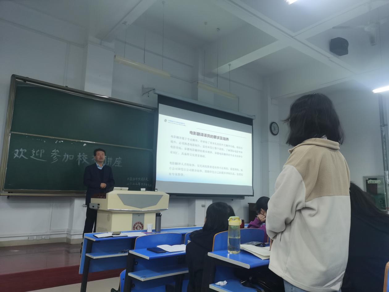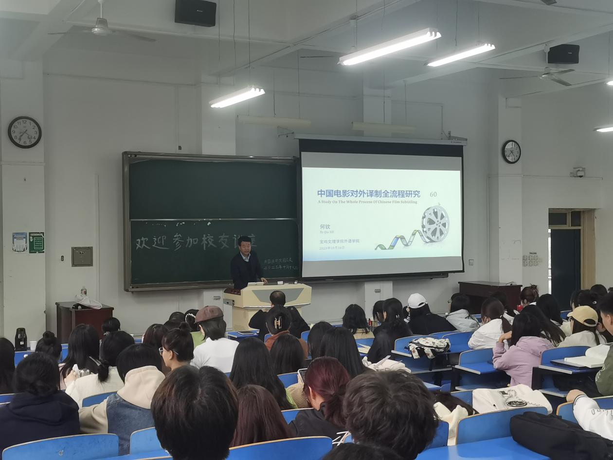 10月16日下午,9728太阳集团1989级校友、北京真之影文化传媒有限公司总经理、电影制片人、学校北京校友分会副会长何钦回到母校,在高新校区立心楼408教室为我院师生作了题为《中国电影对外译制全流程研究》(A Study On The Whole Process of Chinese Film Subtitling)的学术讲座。