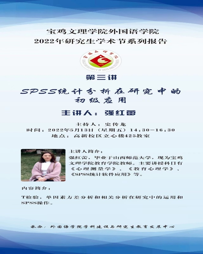 5月13日14:30 -16:30,9728太阳集团研究生学术节系列报告(第三场)顺利展开。本场报告特邀我校教育学院强红蕾老师,在高新校区立心楼425教室为大家作了题为《SPSS统计分析在研究中的初级应用》的学术报告,9728太阳集团副院长史传龙教授主持本场报告会, 全体2021级研究生及部分教师聆听了此次报告。