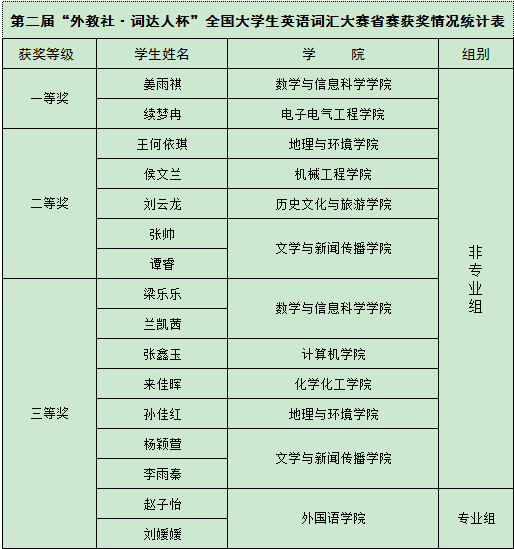 近日,我校学生在第二届“外教社·词达人杯”全国大学生英语词汇大赛中取得优异成绩。本科非英语专业组的姜雨祺、续梦冉2位同学获省赛一等奖,王何依琪等5名同学获省赛二等奖;本科英语专业组的赵子怡、刘媛媛2位同学获省赛三等奖。
