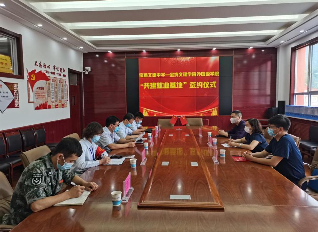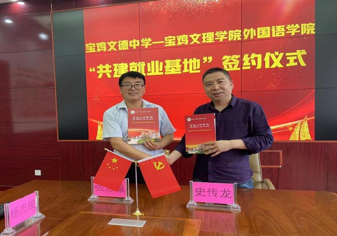 5月26日下午,学院党委书记官莉萍、副院长史传龙一行走访宝鸡市文德中学,回访校友,签订合作协议,建立就业基地,带回了高中英语、生物、语文、体育等教师岗位。