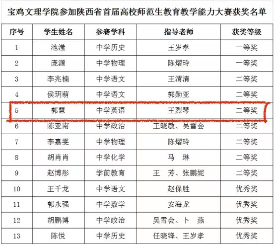 近日,我校13名本科师范生以线上的方式参加了陕西省首届高校师范生教育教学能力大赛决赛,荣获一等奖2项,二等奖7项,优秀奖4项,其中我院学生郭慧荣获二等奖。