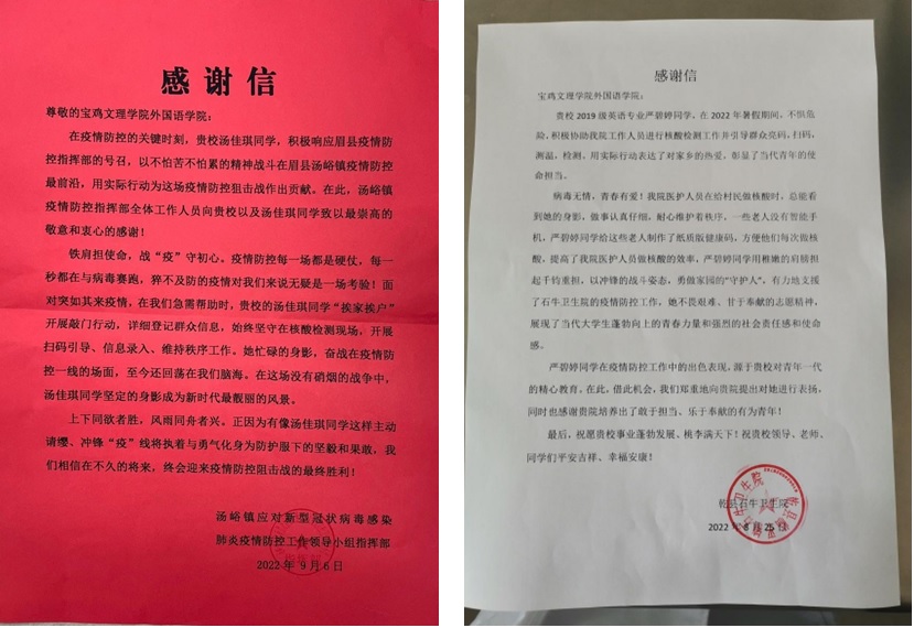 病毒无情,青春有爱。近日,9728太阳集团党委收到两封分别来自宝鸡市眉县汤峪镇疫情防控部门和咸阳市乾县石牛卫生院寄来的感谢信。在感谢信中,两部门对2019级英语3班汤佳琪和2019级英语2班严碧婷积极参与当地疫情防控工作,用实际行动为家乡奉献青春力量给予高度赞扬,感谢学校培养出敢于担当、乐于奉献的有为青年!