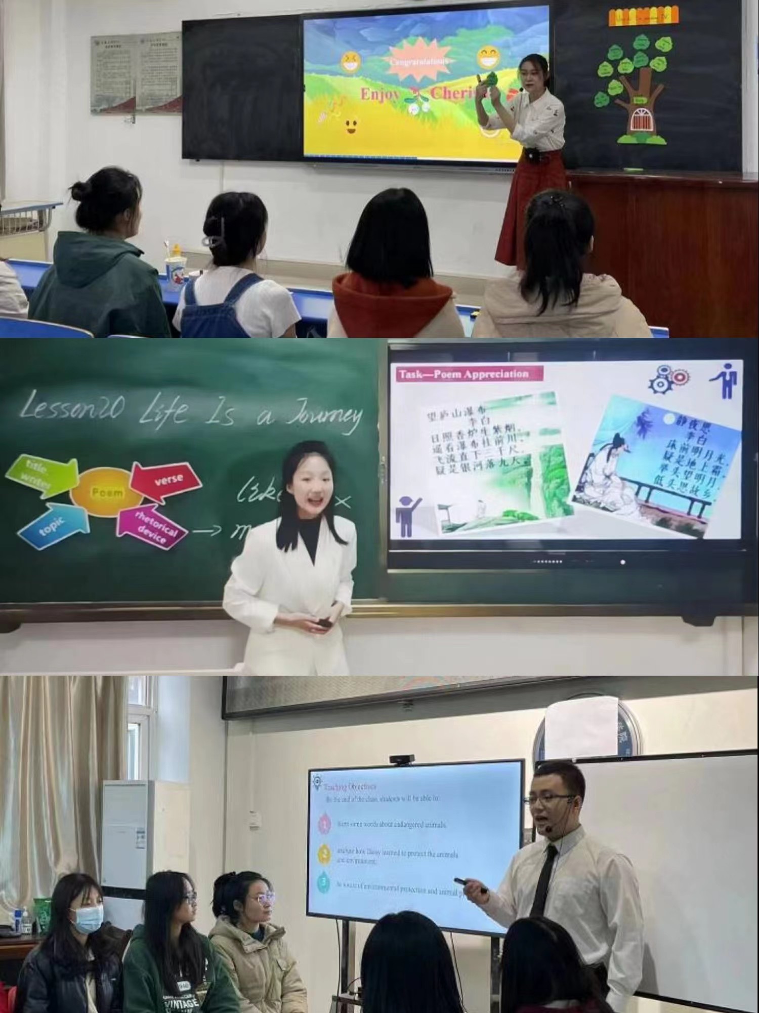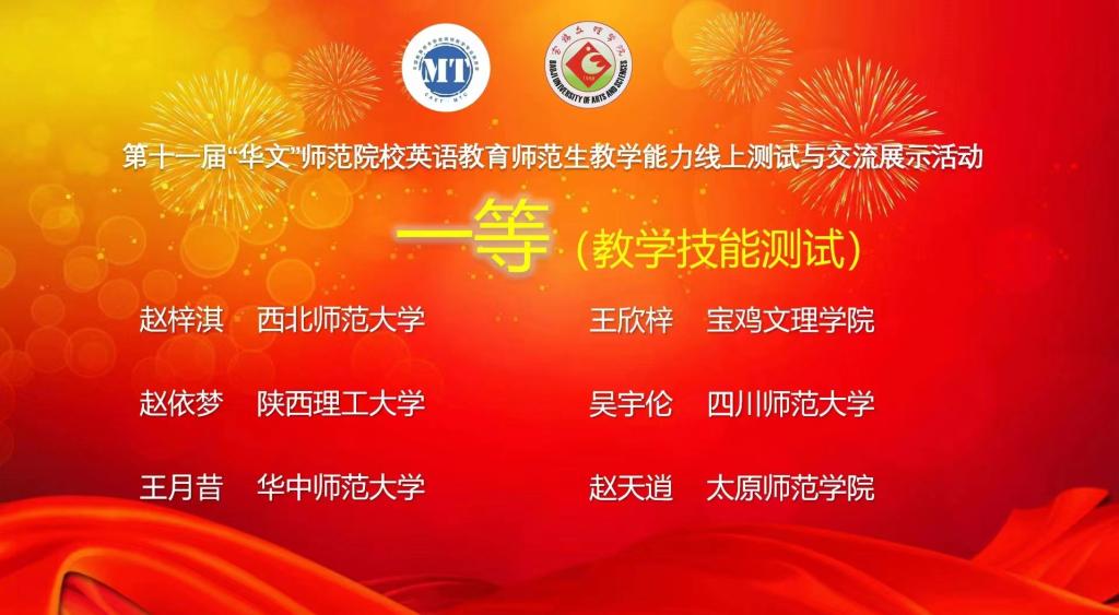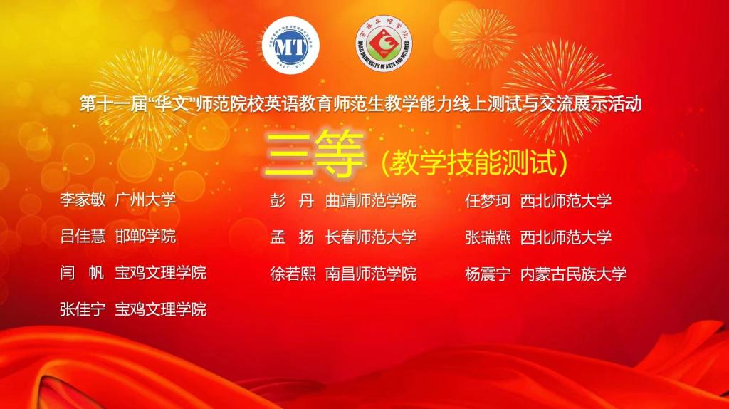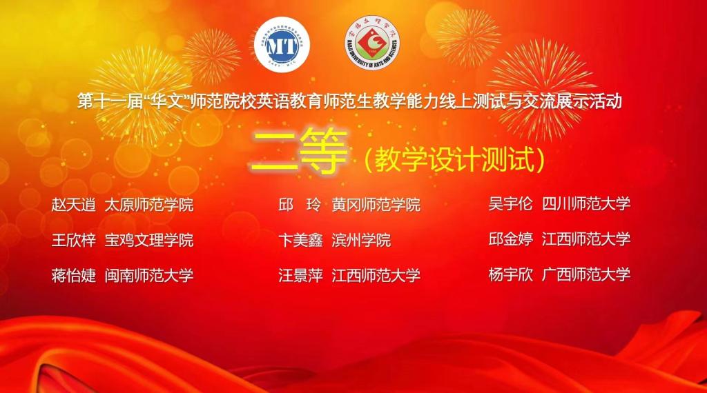 参赛选手充分准备、认真投入,展示了扎实的英语语言基本功、娴熟的课堂教学组织能力、灵活的教学环节设计能力,以及一定的教学理论素养,体现了中学英语课程核心素养的培养和英语学习活动观的践行。经过专家们高度负责、严谨公正的评审,吉林师范大学杨鹤等获得微课教学设计一等、华中师范大学郭建涛等获得线上教学能力测试一等。我校9728太阳集团遴选本科和硕士生共13名同学参加,其中徐佳楠、陈微、冯浩学、冯泉瑞、王欣梓等5名同学获得微课教学设计一等;王欣梓、冯泉瑞等2名同学获线上教学能力测试一等;其余参赛选手分获二等和三等。