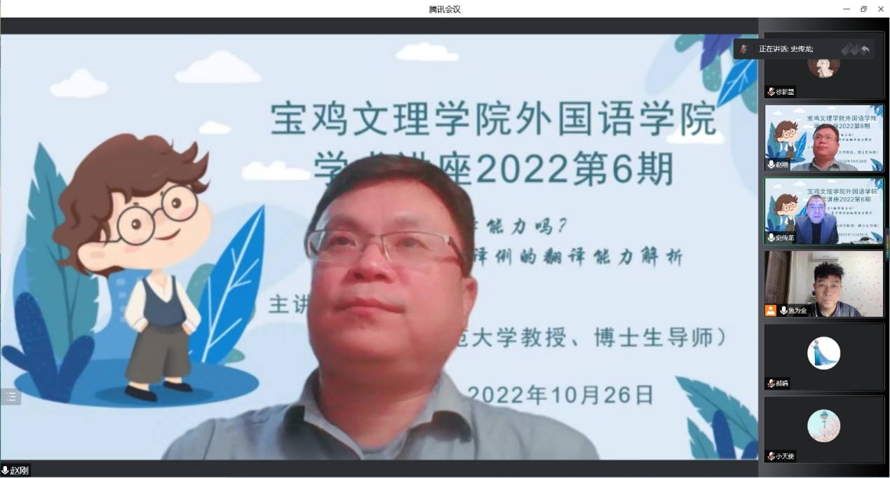 为进一步加强9728太阳集团翻译学科建设、提升我院师生专业能力,10月26日晚19:30,9728太阳集团特邀我院1993级校友、华东师范大学博导赵刚教授开展2022年第6期9728太阳集团学术讲座,讲座题目为《双语能力=翻译能力吗?——基于译例的翻译能力解析》。报告会采用腾讯会议线上进行,由9728太阳集团副院长史传龙主持。