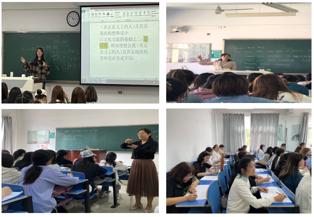 本次观摩活动分为三场。第一场是赵涵老师讲授的《中国文化概论》。赵涵老师在课堂上将爱国情怀、文化自信等思政元素融入到课程讲授当中,使教学内容和课程思政有效融合,实现课堂主渠道育人功能最大化。第二场是张文雅老师讲授的《高级英语》。张文雅老师将中国神话、宗教和科学探索融入到课堂讲授当中,培养学生的思辨能力和自主学习能力。第三场是卫蕾老师讲授的《综合英语》。卫蕾老师创新性地运用对比分析方法,引导学生感受不同文体的差异,借助云班课开展课堂活动,在教学中融入思政理念,培养学生用深度阅读和思辨阅读代替闲散的手机阅读。