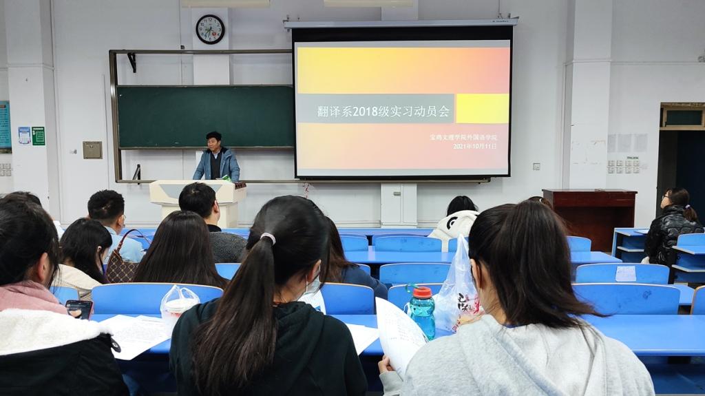10月11日晚七点半我院翻译系在立心楼408召开了18级翻译专业实习动员会,翻译系主任鱼为全、副主任黄龙飞及18级1,2班实习生共计51人参会。