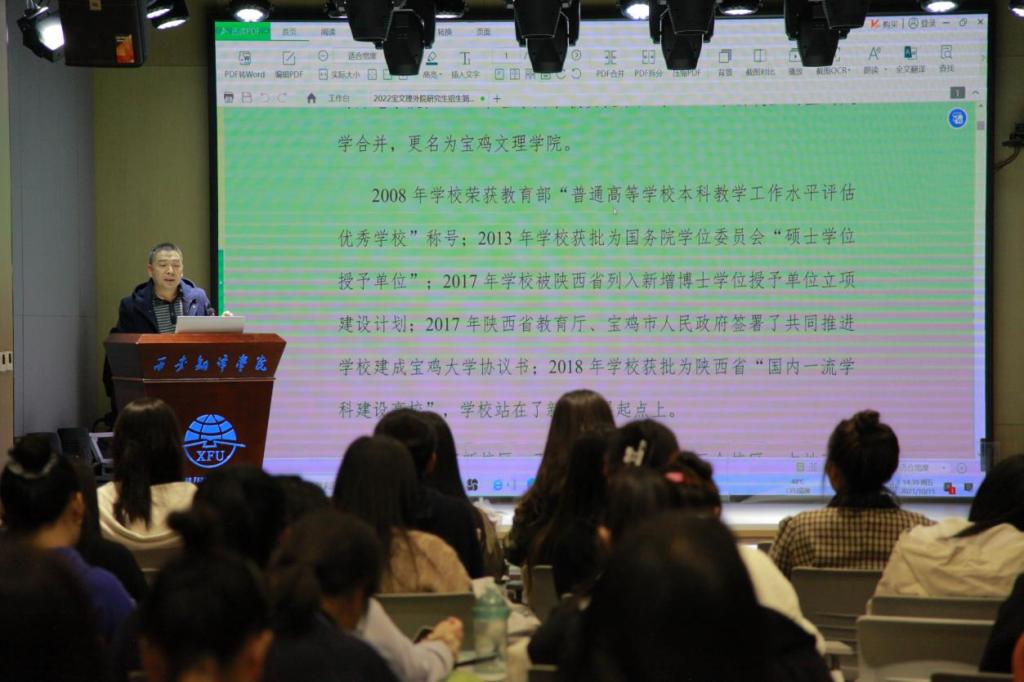 10月15日,副院长史传龙教授应邀前往西安翻译学院英文学院做2022年研究生招生宣讲。西安翻译学院英文学院近百名本科生参加宣讲会。宣讲会由西安翻译学院英文学院副院长李燕教授主持。