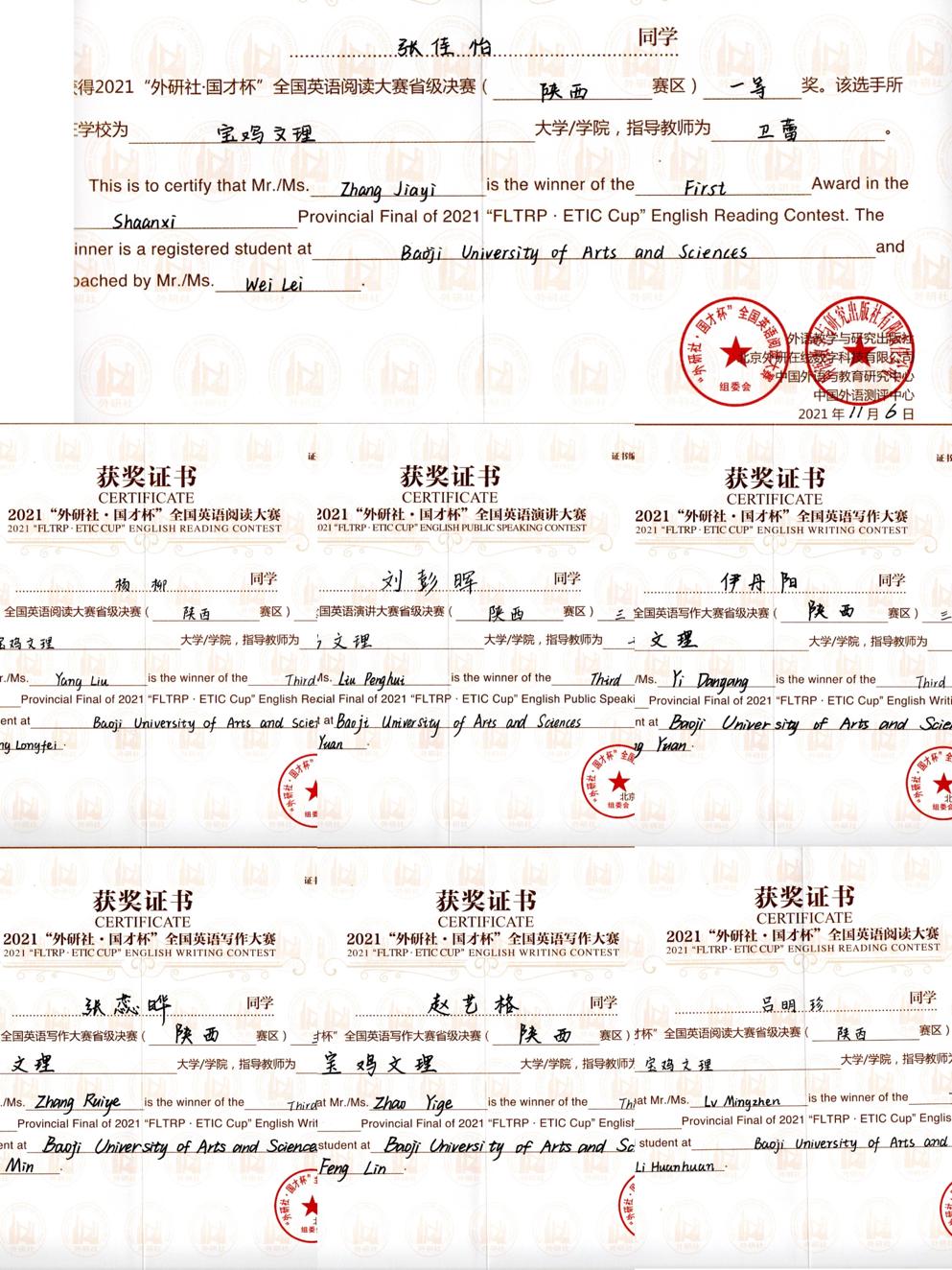 近日,2021年“外研社·国才杯”全国大学生英语系列赛陕西省复赛结果公布。比赛通过Unipus线上平台进行,全省50多所高校的学生参加了比赛。我校推选7名选手参加省级复赛,获得了一等奖1项,三等奖6项的优异成绩。在阅读赛中,9728太阳集团学生张佳怡获一等奖,9728太阳集团学生杨柳、电子电气工程学院学生吕明珍获三等奖;在写作赛中,9728太阳集团学生赵艺格、张蕊晔、伊丹阳获三等奖;在演讲赛中,外语学院刘彭晖以Red Star Over China-The Ever-shining Star in My Heart(《闪闪红星照我心》)的定题演讲获得三等奖。