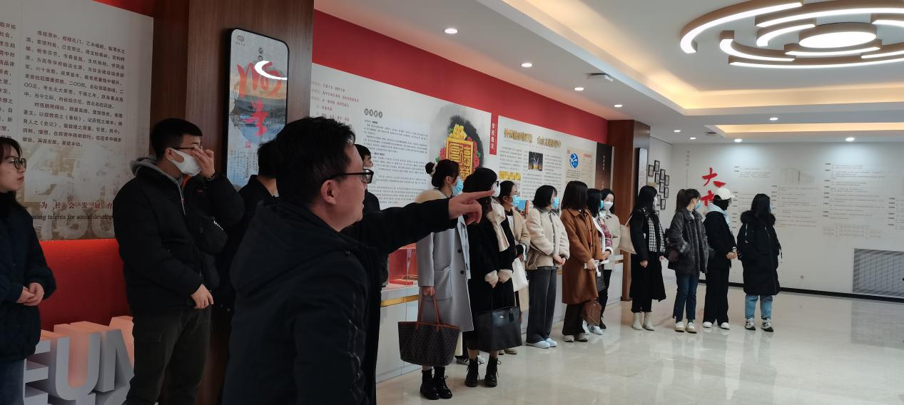 在校史馆内,渭滨中学校党委副书记桂刚老师对该校的校训、校歌、历史大事件、历届领导、师资队伍、教学名师、优秀校友以及主要荣誉等进行了充分的介绍,让同学们深切感受到渭滨中学从建校之初筚路蓝缕至今日的辉煌进程。同时桂书记也给在场的研究生们送出了自己的期望和祝福,希望各位同学能够奋发图强,刻苦努力,不断提升自身专业知识和技能,早日加入“名师队伍”中。