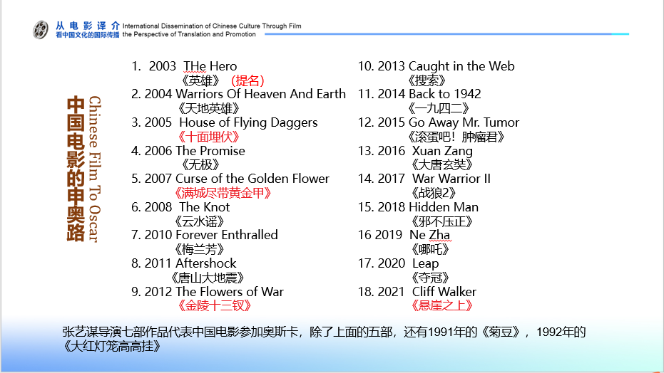 讲座尾声,何钦先生介绍了自加入WTO以来,中国电影申报奥斯卡的过程以及他们团队做的作品。他认为,中国电影的对外译介虽然存在这样那样的问题,但相信中国电影的对外译介会越来越好。