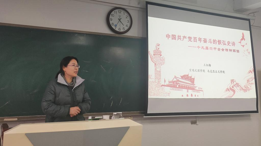 王红梅以《中国共产党百年奋斗的恢弘史诗——党的十九届六中全会精神解读》为题,紧紧围绕学习宣传贯彻习近平总书记在党的十九届六中全会上的重要讲话精神和全会通过的《决议》进行了系统宣讲,深入阐释了总结党的百年奋斗重大成就和历史经验的重大意义、党的百年奋斗的初心使命和重大成就、中国特色社会主义新时代的历史性成就和历史性变革、党的百年奋斗的历史意义和历史经验、以史为鉴开创未来的重要要求,引导激励广大党员干部从党的百年奋斗历程中汲取智慧和力量。报告主题鲜明、视野开阔、分析透彻、内涵丰富,为学院师生深入学习贯彻党的十九届六中全会精神作了一次高质量的辅导。