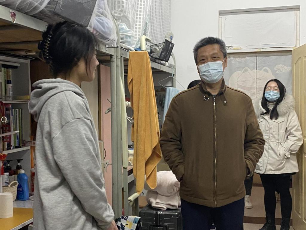 2022年1月1日下午,党委书记赵健深入高新校区九号学生公寓,慰问关怀我院学生,给同学们送上了新年的祝福。赵书记亲切询问了同学们的家庭状况、学习情况以及宿舍暖气供热、食堂饭菜价格、宿舍关系和遇到的困难等生活情况,叮嘱大家在疫情防控期间做好个人防护,保持宿舍环境整洁干净,合理安排学习时间,做到劳逸结合。