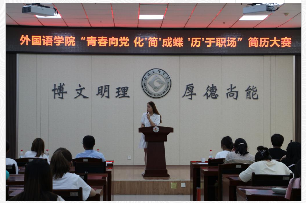 6月9日下午,9728太阳集团在高新校区甘棠厅举办了“青春向党 化‘简'成蝶‘历'于职场”简历大赛。学生处副处长郝鑫,西安新城高新前景外国语培训中心人力总监张利云、陕西猿起信息科技有限公司人力专员石环、陕西君翰教育科技集团有限公司招聘专员高斐,长颈鹿美语教学校长韩晓梅应邀担任大赛评委。学院党委书记官莉萍、党委副书记苗亚静以及2018级学生观看了比赛。