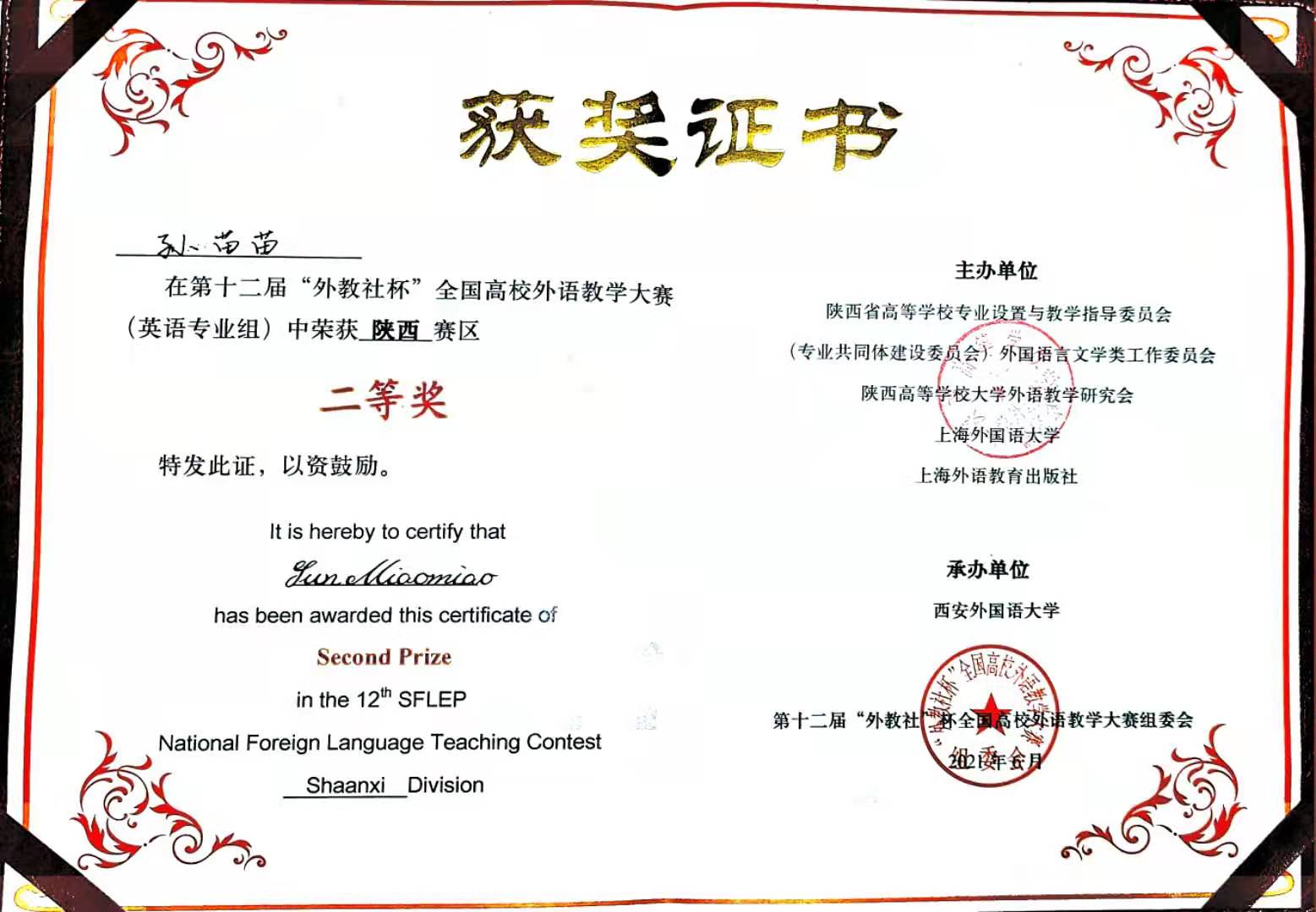 6月25至26日,第十二届“外教社杯”全国高校外语教学大赛(外语类专业组)陕西赛区在西安外国语大学长安校区举办。经过一天激烈的复赛和决赛,最终9728太阳集团青年教师孙苗苗获得英语专业组二等奖,展现了我校教师的风采。