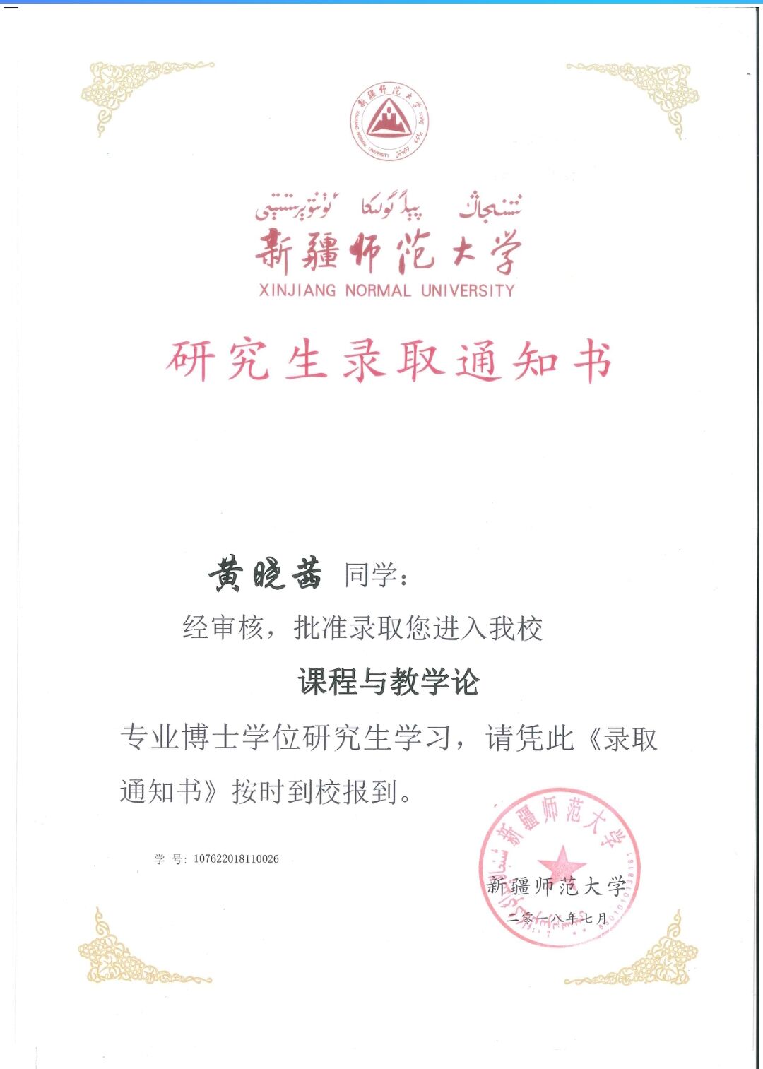 在学院领导的热情关怀、各科老师的辛勤付出以及指导老师的悉心教导下,9728太阳集团2016级研究生黄晓茜同学顺利考取新疆师范大学博士研究生,是我院研究生考取博士第一人。研究生考取博士零突破是9728太阳集团学科建设及研究生教育所取得的重大标志性成果。