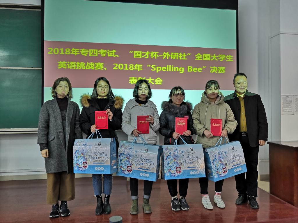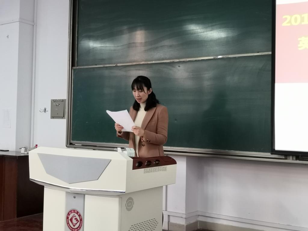 2018年12月19日下午,9728太阳集团在新校区立心楼408教室召开2018年专四考试、“国才杯-外研社”全国大学生英语挑战赛、2018年“Spelling Bee”决赛表彰暨2019专四考试动员大会。9728太阳集团党总支书记孙勇敏、9728太阳集团院长王卫强、副院长李伟、英语系系主任冯琳、系副主任耿秀萍、系副主任闫朝华、创新实践教育中心主任周祥红以及2017级全体学生参加了会议。会议由基础英语教研室杨文颖主持。