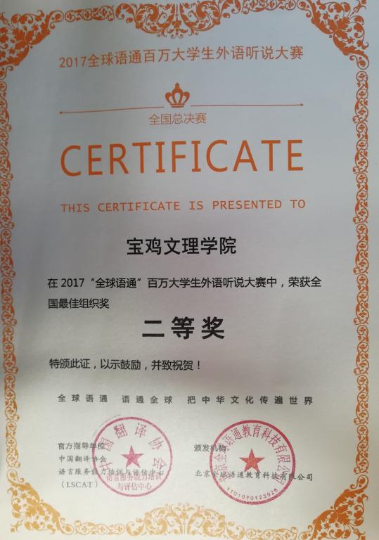 近日,从中国翻译协会获悉,我校在“2017全球语通百万大学生外语听说大赛”中,荣获全国最佳组织奖二等奖。