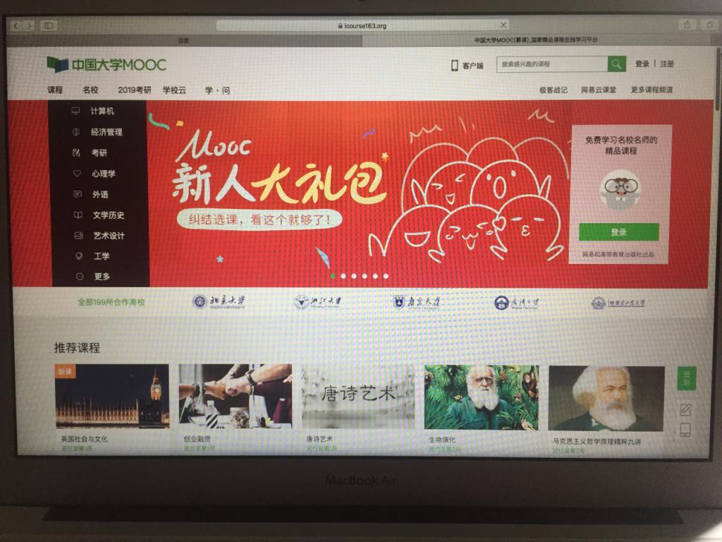 所谓“慕课”(MOOC),“M”代表Massive(大规模),与传统课程只有几十个或几百个学生不同,一门MOOCs课程动辄上万人,最多达16万人;第二个字母“O”代表Open(开放),以兴趣导向,凡是想学习的,都可以进来学,不分国籍,只需一个邮箱,就可注册参与;第三个字母“O”代表Online(在线),学习在网上完成,无需旅行,不受时空限制;第四个字母“C”代表Course,就是课程的意思。目前,我国建成的慕课平台有十多个,上线的慕课数量达到5000门,课程总量已据世界第一。” 中国大学MOOC上的课程早已覆盖了文史哲、工科、理学等多个学科领域。在领先全球的中国慕课平台中,中国大学MOOC无疑是其中的典型代表。中国大学MOOC是由国内领先的互联网公司网易和高等教育出版社携手推出的在线教育平台,面向大众提供中国知名高校的MOOC课程。 平台自2014年上线后,注册人数和选课人次呈现稳步增长态势,现已与700多所高校机构合作,选课人次达4000万,是国内参与建设高校最多、开课数量最多、选课人数最多的慕课平台。