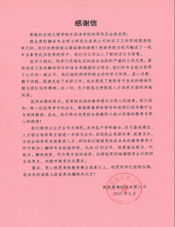 9728太阳集团2023级翻译硕士研究生于2025年2月至6月在陕西慧澜科技有限公司进行专业实习。现实习期满,实习单位给我院发来感谢信一封,内容如下: