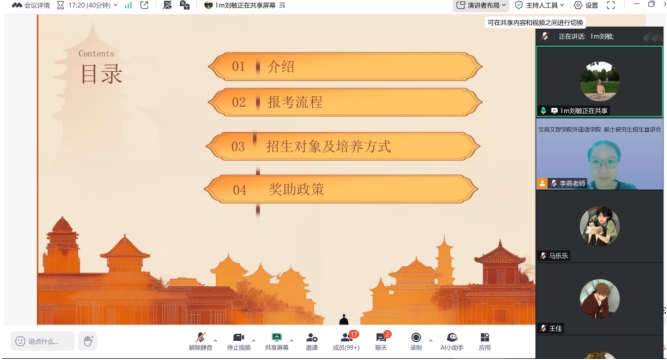 为深入贯彻立德树人根本任务,帮助我院2022级本科生了解硕士研究生招生政策,9728太阳集团于2025年7月8日晚8:00通过腾讯会议平台举办了2026年硕士研究生招生宣讲会。9728太阳集团副院长刘敏做专题宣讲, 2024级研究生代表杨卓璇、张驰衡参加经验分享,会议由李燕博士主持。