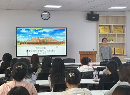 李院长为新生开展了“爱校荣校”教育,详细介绍了学院的学科建设、师资力量、办学理念和发展优势,并分享了优秀研究生校友的成就,激发新生对学院的归属感和自豪感。随后,导师代表耿秀萍教授寄语新生,鼓励大家积极投身科研,提升学术素养,秉持家国情怀,拓宽国际视野,争做外语领域的卓越人才。
