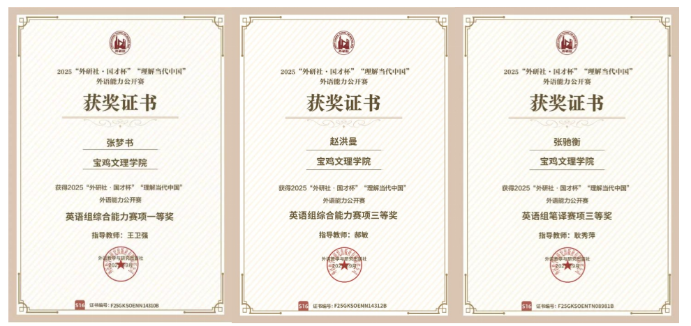 近日,由外语教学与研究出版社主办的2025“外研社·国才杯”“理解当代中国”外语能力公开赛中,我院2024级硕士研究生张梦书、赵洪曼、张驰衡荣获英语组综合能力赛项一等奖和三等奖、英语组笔译赛项三等奖。